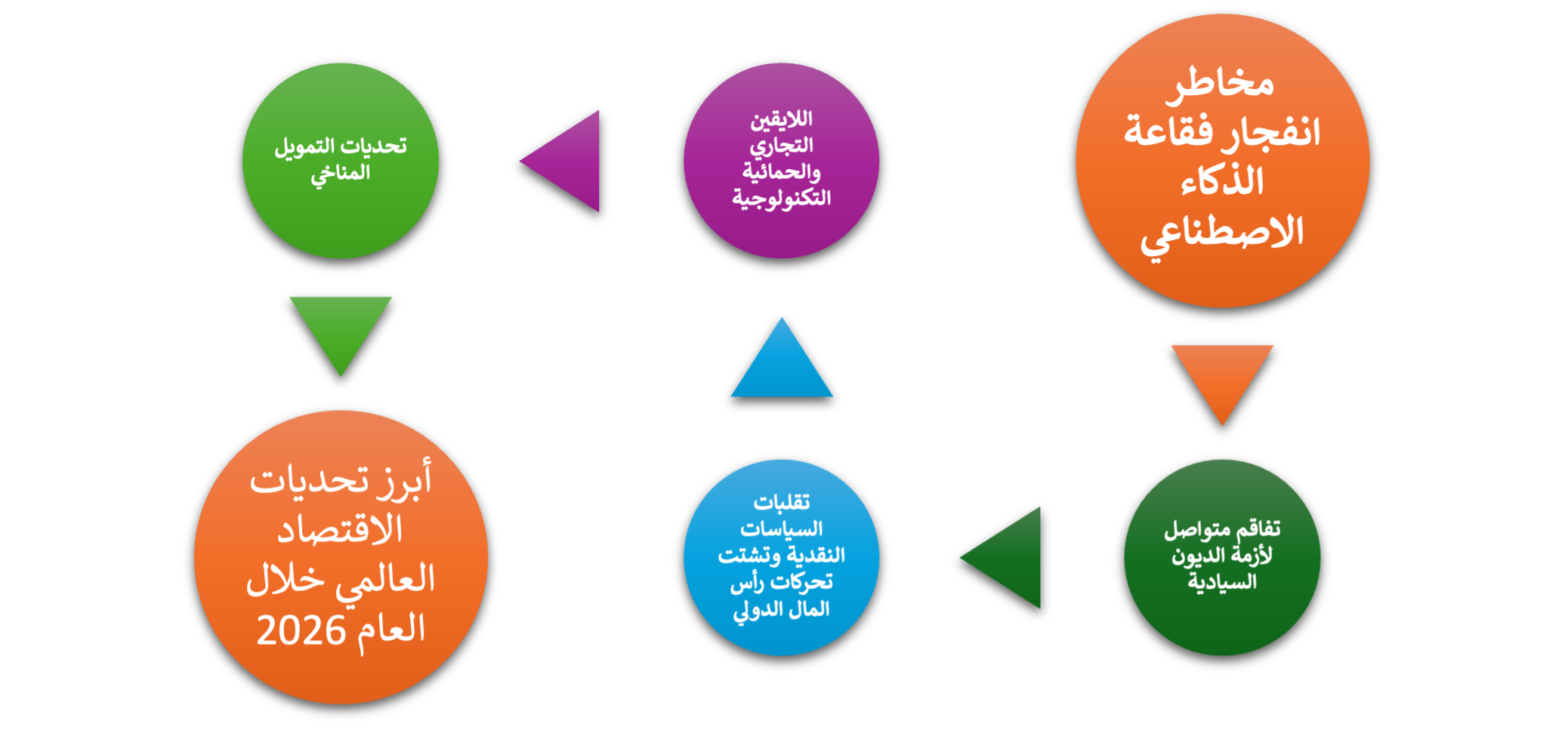 وإذا كان الاقتصاد العالمي قد عانى في العام المنصرم 2025 تحديات متنوعة، فإن استشرافًا سريعًا لعام 2026 يُبرز خمسة تحديات/مخاطر ستؤثر على مسارات التعافي الاقتصادي عالميًّا توضحها النقاط الآتية: