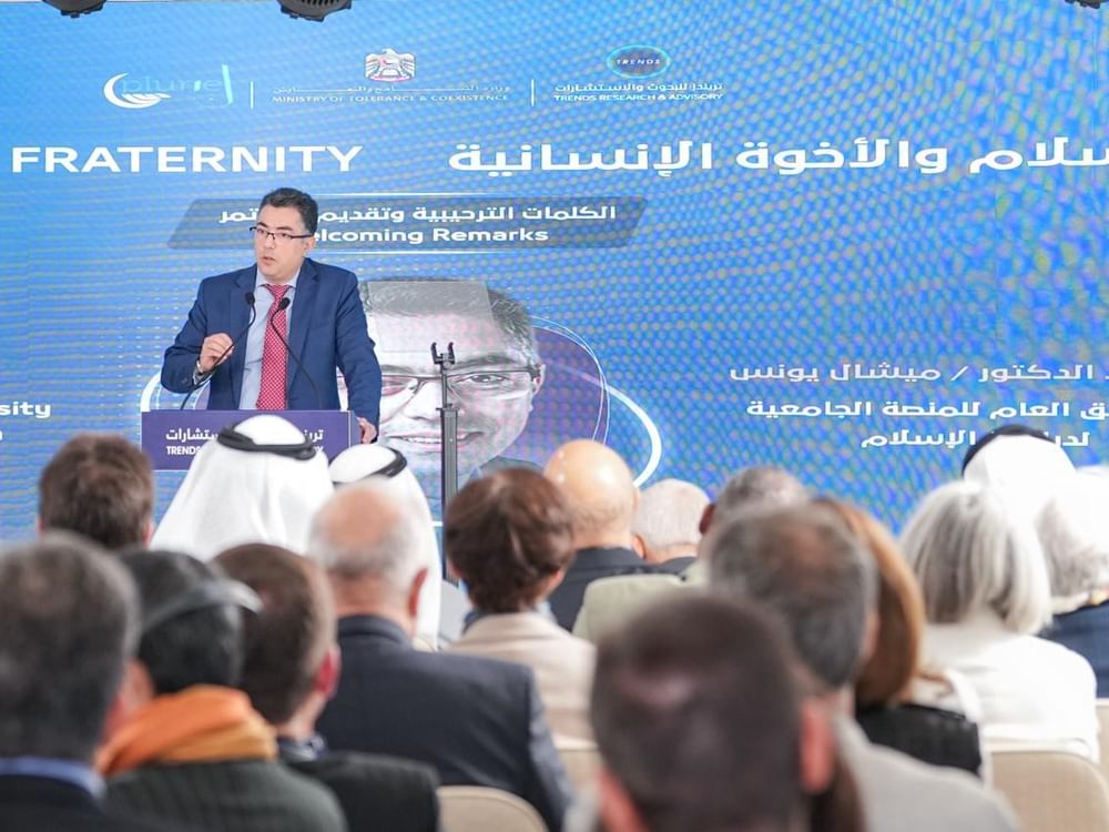 وفي كلمة ترحيبية ثمن الدكتور ميشيل يونس عميد كلية الدراسات الدينية بالجامعة الكاثوليكية بمدينة ليون والمنسق العام للمنصة الجامعية لدراسة الإسلام، بجهود مركز تريندز للبحوث والاستشارات بالشراكة مع وزارة التسامح والتعايش في تنظيم ودعم المؤتمر وتسهيل تنظيمه، مؤكداً أهمية المؤتمر في ظل التحديات التي تواجه العالم اليوم، وأهمها التطرف والاقصاء.