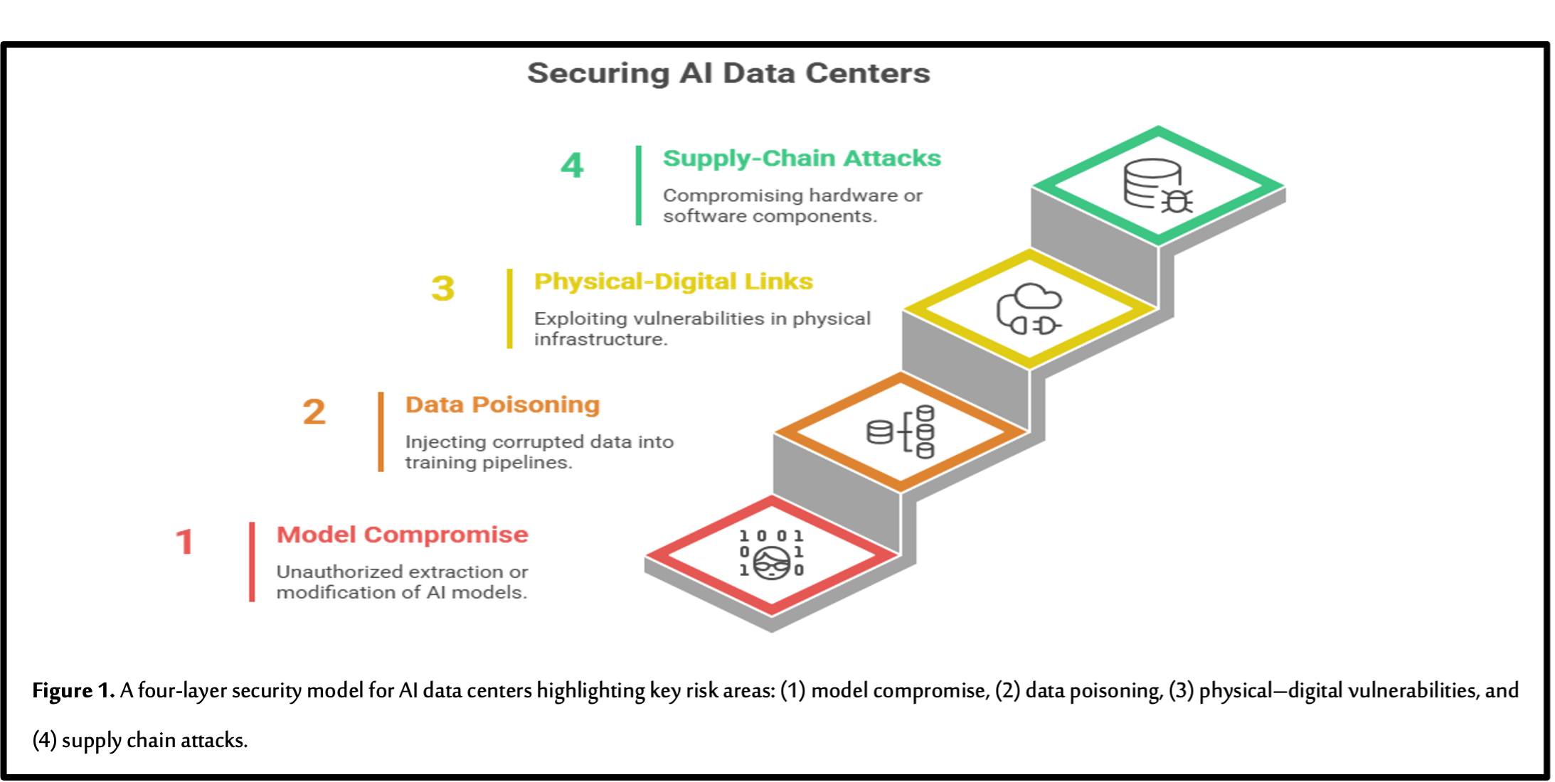 This paper identifies four primary threats to AI data centers: model compromise and theft, data poisoning and process-line attacks, infrastructure disruption through cyber-physical interactions, and supply chain and firmware vulnerabilities. Research findings suggest that these apprehensions could trigger cascading effects across diverse sectors and geographical regions.