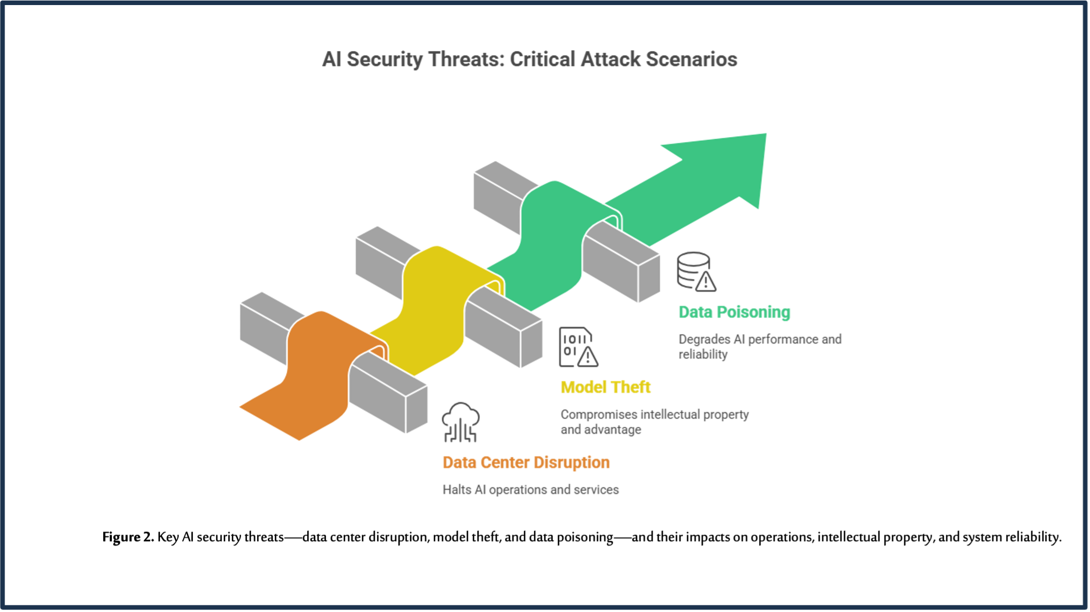 Through an examination of realistic threat vectors and potential attack scenarios, such as operational disruption, model theft, and data poisoning, the study underscores the systemic risks linked to breaches of AI infrastructure.