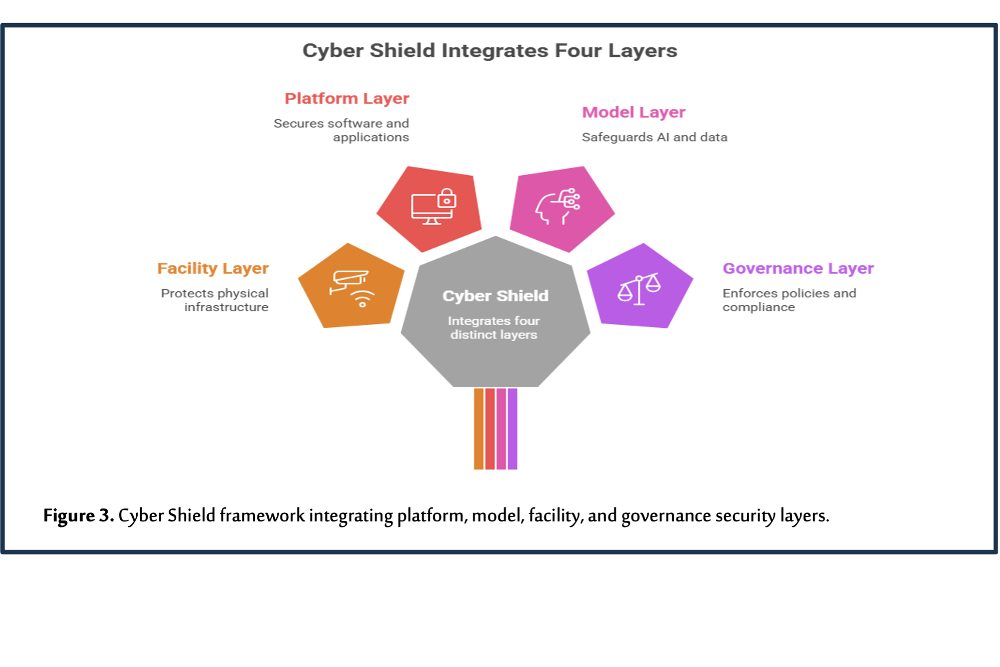 In this context, the Cyber Shield AI Infrastructure framework offers a practical approach to addressing these challenges. [56] Instead of viewing data center security as solely a technical issue for service providers, the framework presents a vision that considers it a shared strategic responsibility requiring coordination across layers of facilities, platforms, models, and governance mechanisms.