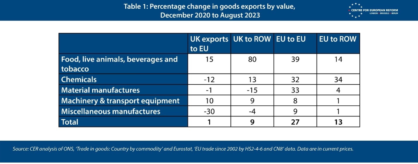 [24] See the full analysis done by the Centre for European Reform: Brexit, four years on: Answers to two trade paradoxes | Centre for European Reform. For more recent data, see also: Weighed down by gravity: UK trade policy after Brexit | Centre for European Reform. Or A perfect storm: Britain’s trade malaise, weak growth and a new geopolitical moment. Recent data from the Office for National Statistics indicates a 3.6% increase in UK exports to the EU in Q2 2025, primarily driven by machinery and transport equipment. See UK trade – Office for National Statistics.