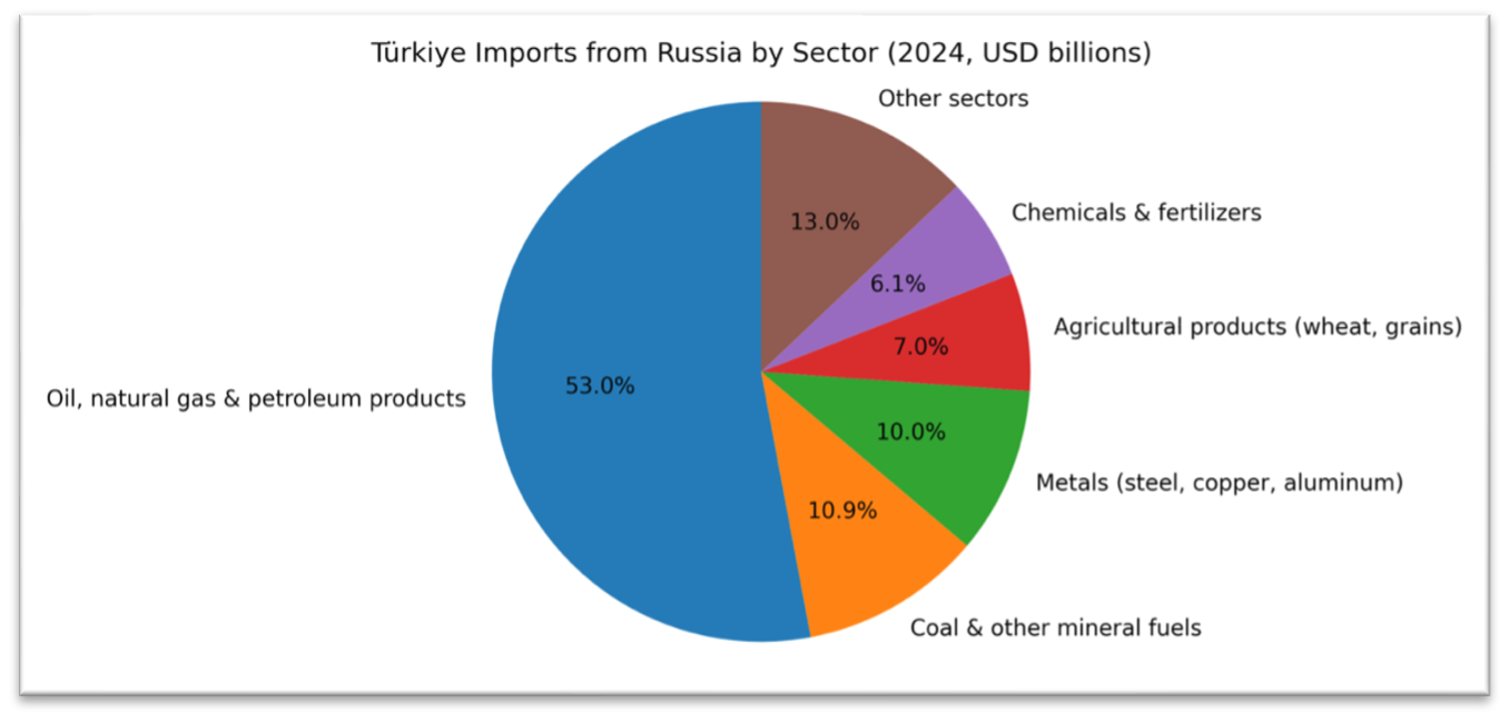 Energy security is a critical pillar of Türkiye’s trade policy, directly impacting the nation’s economic stability and growth prospects. Türkiye’s energy landscape is characterized by a marked reliance on imported resources, with hydrocarbons, especially natural gas and oil from Russia, constituting a substantial proportion of its energy supply. This dependency exposes Türkiye to significant strategic risks, as fluctuations in bilateral relations or disruptions in Russian energy flows could undermine the country’s economic and political interests.