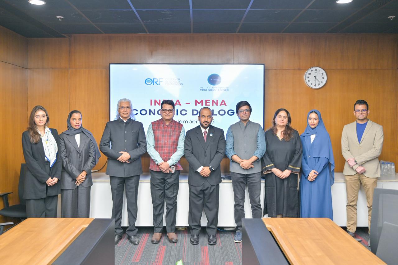 في إطار جولته البحثية في الهند، وتعزيزاً للحوار الفكري وبناء جسور التعاون الاستراتيجي مع المؤسسات البحثية والأكاديمية والفكرية، نظم مركز تريندز للبحوث والاستشارات، عبر مكتبه الافتراضي في نيودلهي، حوار «تريندز-أوبزرفر» الاقتصادي، تحت عنوان «التعاون الاقتصادي بين منطقة الشرق الأوسط وشمال إفريقيا والهند.. تبادل المعرفة وبناء الشراكات وتطوير الاستراتيجيات»، وذلك بالشراكة مع مؤسسة أوبزرفر للأبحاث في مقر مركز الدكتور أمبدكار الدولي بالعاصمة الهندية نيودلهي.