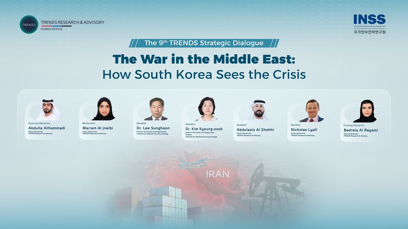 The event brought together an elite group of experts and decision-makers to analyze the repercussions of the war in the Middle East and its profound implications for the international system. Amid a highly complex international context, TRENDS Research & Advisory, in cooperation with the Institute for National Security Strategy (INSS), organized a high-level strategic seminar as part of the 9th TRENDS Strategic Dialogue. The event brought together an elite group of experts and decision-makers to analyze the repercussions of the war in the Middle East and its profound implications for the international system, with a specific focus on South Korea’s repositioning in a changing global environment. Participants emphasized that the world is at a pivotal turning point, as the current crisis is no longer merely a regional conflict but is reshaping international balances. This shift is driving major economic powers—led by South Korea—to reformulate their security and economic doctrines comprehensively. Opening Reading The session commenced with Abdullah Al-Hammadi, Main Researcher at TRENDS, who stressed that the Middle East is witnessing rapid, complex developments in which political, security, and economic dimensions intersect in unprecedented ways, necessitating a comprehensive re-reading of the global geopolitical landscape. Al-Hammadi explained that the crisis’s repercussions have transcended regional borders, impacting global energy markets, international supply chains, and the broader system of global security and stability. He noted that understanding South Korea’s vision regarding these developments represents an important entry point for analyzing the ongoing international transformations in light of the increasing interconnectedness between economy and security. An Integrated Analytical Approach The session was moderated by Maryam Mohammed Al-Junaibi, Director of the Monitoring and Digital Analysis Department at “TRENDS – Dubai,” who precisely directed the discussion toward its strategic themes. She worked on linking the interventions within a coherent analytical framework that reflects the depth of the ongoing shifts and their various impacts at both regional and international levels. Strategic Independence Lee Seong-hoon, Director of Strategic Security Studies at INSS, presented a critical reading of the future of international alliances, noting that the current crisis has revealed a clear shake in the credibility of American leadership on the international stage. He explained that South Korea is moving seriously toward enhancing its strategic independence, diversifying its international partnerships, and reducing its absolute reliance on the American security umbrella. Lee Seong-hoon pointed out that redeploying American defense systems from the Korean Peninsula to other regions has created a security gap at a time when regional threats are escalating, confirming that the current stage represents an “era of multi-chaos.” Rules of the Game In turn, Nicholas Lyall, Main Researcher at TRENDS, addressed the concept of “weaponizing the global commons,” noting that vital corridors such as the Strait of Hormuz are no longer merely arteries of international trade but have effectively become tools of geopolitical pressure. He explained that targeting navigation and vital facilities poses a direct threat to the global economy, indicating that this pattern may extend to other strategic corridors, such as the Strait of Malacca, which threatens to redefine the rules of international security and open a new stage of economic pressures with a geopolitical dimension. Economic Pressures In the economic context, Kim Kyung-sook, Head of the Center for Supply Chain Studies at INSS, provided an in-depth analysis of the crisis’s repercussions on the global economy. She noted that approximately 20% of global oil and 25% of liquefied natural gas pass through the Strait of Hormuz, and that South Korea relies on the Middle East for about 70% of its total oil imports. Kim Kyung-sook warned that escalating tensions could push oil prices to record levels of up to 200 dollars per barrel, causing sharp disruptions to global supply chains and leaving direct, painful impacts on technology industries, particularly the semiconductor sector. Defense Cooperation In one of the seminar’s most prominent themes, TRENDS Main Researchers Abdulaziz Al-Shehhi and Nicholas Lyall presented an in-depth discussion of radical transformations in the war and defense industries, asserting that what is happening in the Middle East is a real laboratory for future wars. Al-Shehhi explained that modern conflicts have revealed a clear transition from conventional warfare to asymmetric warfare, with the widespread use of low-cost drones and the intensive employment of artificial intelligence and advanced technologies. He noted that this shift requires countries to develop multi-layered smart defense systems capable of simultaneously addressing threats that are rapid, complex, and low-cost. In this context, Al-Shehhi confirmed that the Korean air defense system (M-SAM 2) in the UAE represents an advanced model for this transformation, as it has demonstrated high operational efficiency in complex environments and a superior ability to intercept multiple, simultaneous targets, with success rates approaching 97%. He noted that this performance is no longer just a technical success but also reflects a strategic shift in the global defense industry market toward more flexible and efficient models. Nicholas Lyall explained that the crisis revealed an increasing gap in defense capabilities among traditional suppliers, driven by rising global demand for air defense systems, the limited effectiveness of some traditional systems against modern threats, and severe pressures on defense supply chains. He emphasized that these facts have opened a wide path for South Korea to transform into a reliable strategic defense partner,