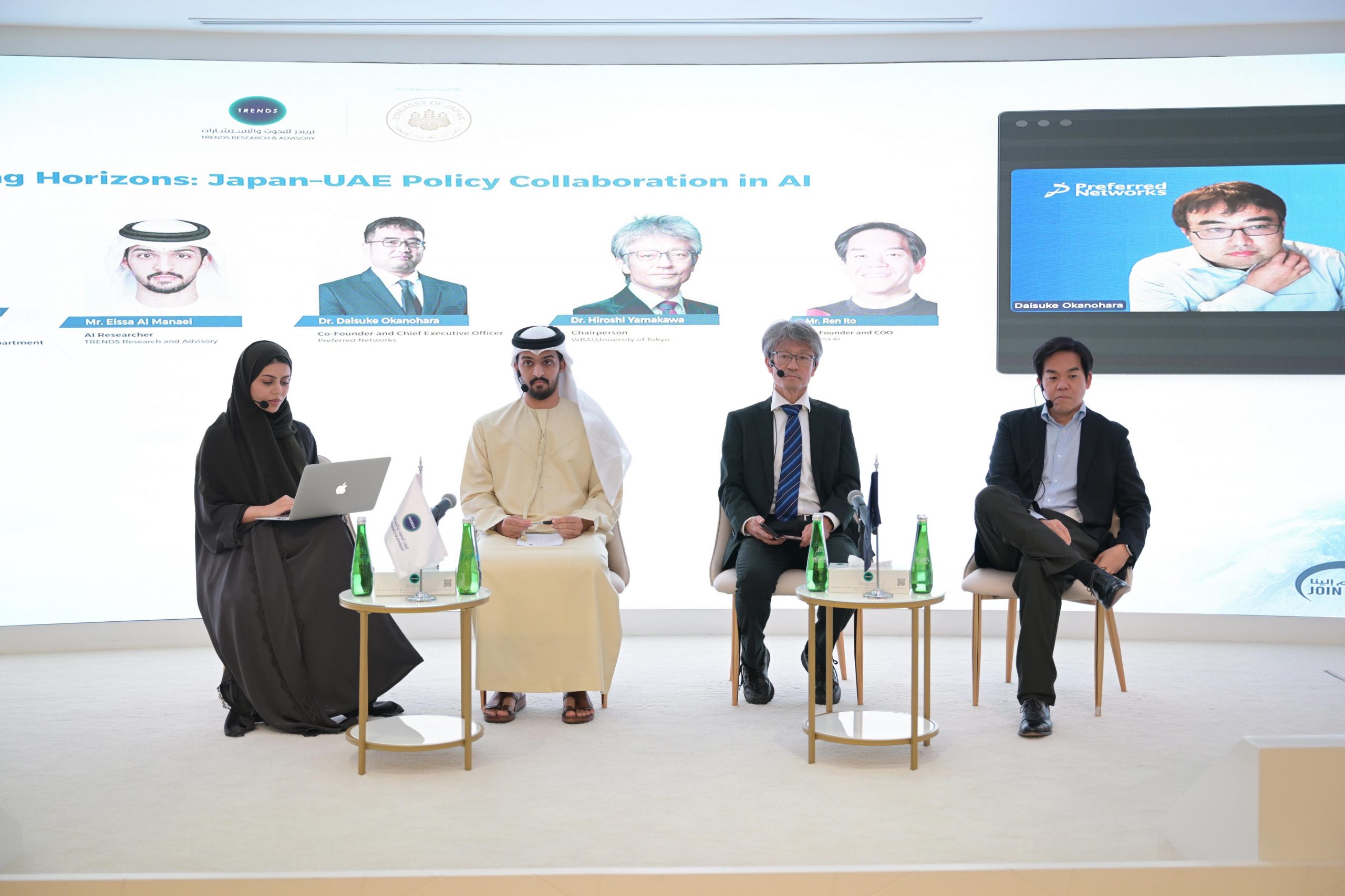 The symposium concluded with the fourth session, titled Bridging Horizons: Japan–UAE Policy Collaboration in AI, moderated by Mouza Al-Marzooqi, Senior Researcher and Director of the Economic Studies Department at TRENDS Research & Advisory. The session featured Eissa Al Manaei, AI Researcher at TRENDS; Mr. Ren Ito, Co-Founder and Chief Operating Officer of Sakana AI; Dr. Hiroshi Yamakawa, World Benchmarking Alliance (WBAI), University of Tokyo; and Dr. Daisuke Okanohara, Co-Founder and Chief Executive Officer of Preferred Networks.