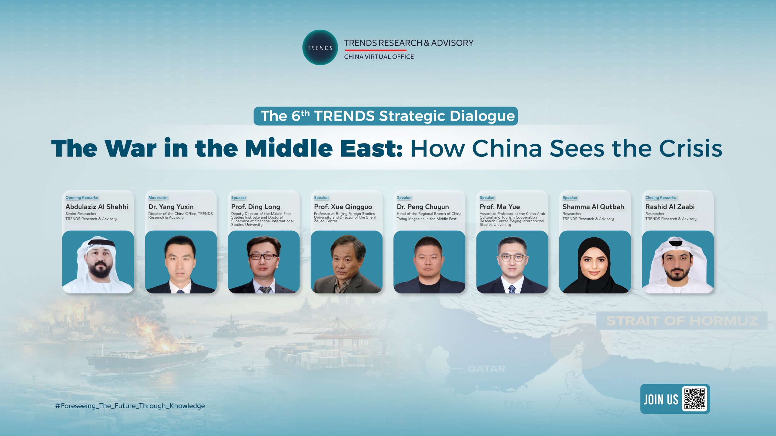 TRENDS Research & Advisory’s Beijing office is organizing its sixth strategic dialogue — The War in the Middle East: How China Sees the Crisis — on Thursday, April 9, 2026. The event will bring together a distinguished group of academics and experts from the People’s Republic of China, alongside TRENDS researchers and specialists, to discuss the dimensions of the ongoing crisis and its geopolitical and economic implications from a Chinese perspective.