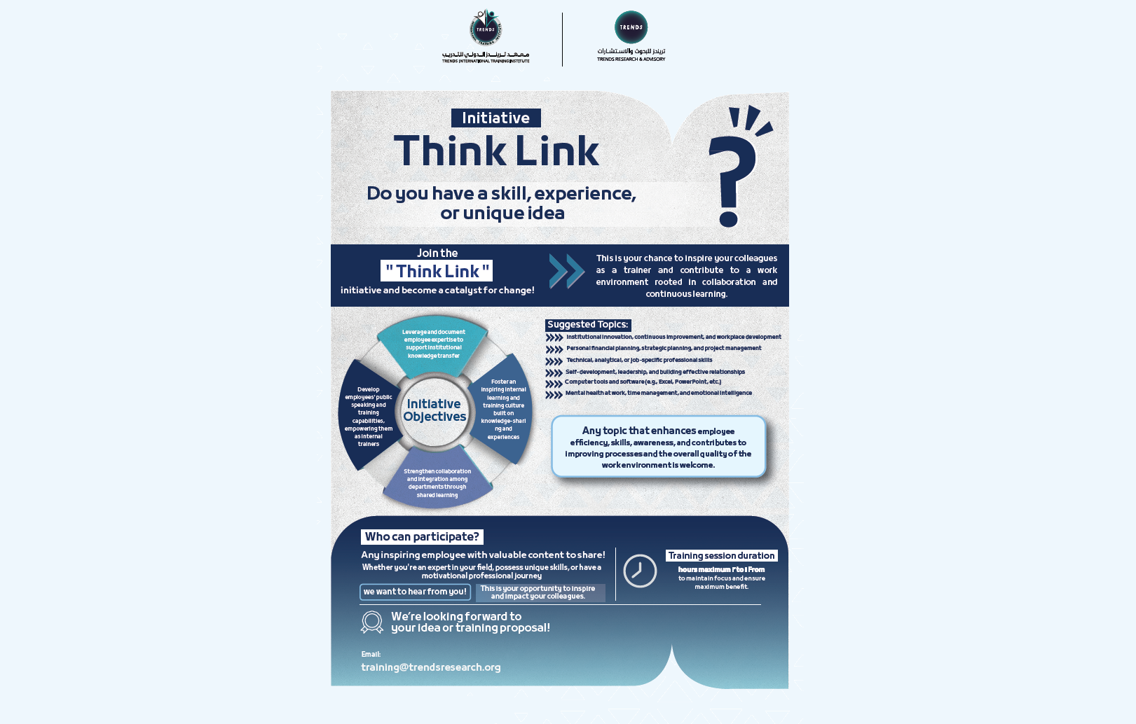 The initiative aligns with TRENDS’ vision of building human capital and creating an environment that nurtures creativity and excellence. By transforming employees’ accumulated expertise into structured training content, Think Link seeks to raise institutional efficiency, strengthen organizational sustainability, and ensure that valuable knowledge benefits the entire organization.