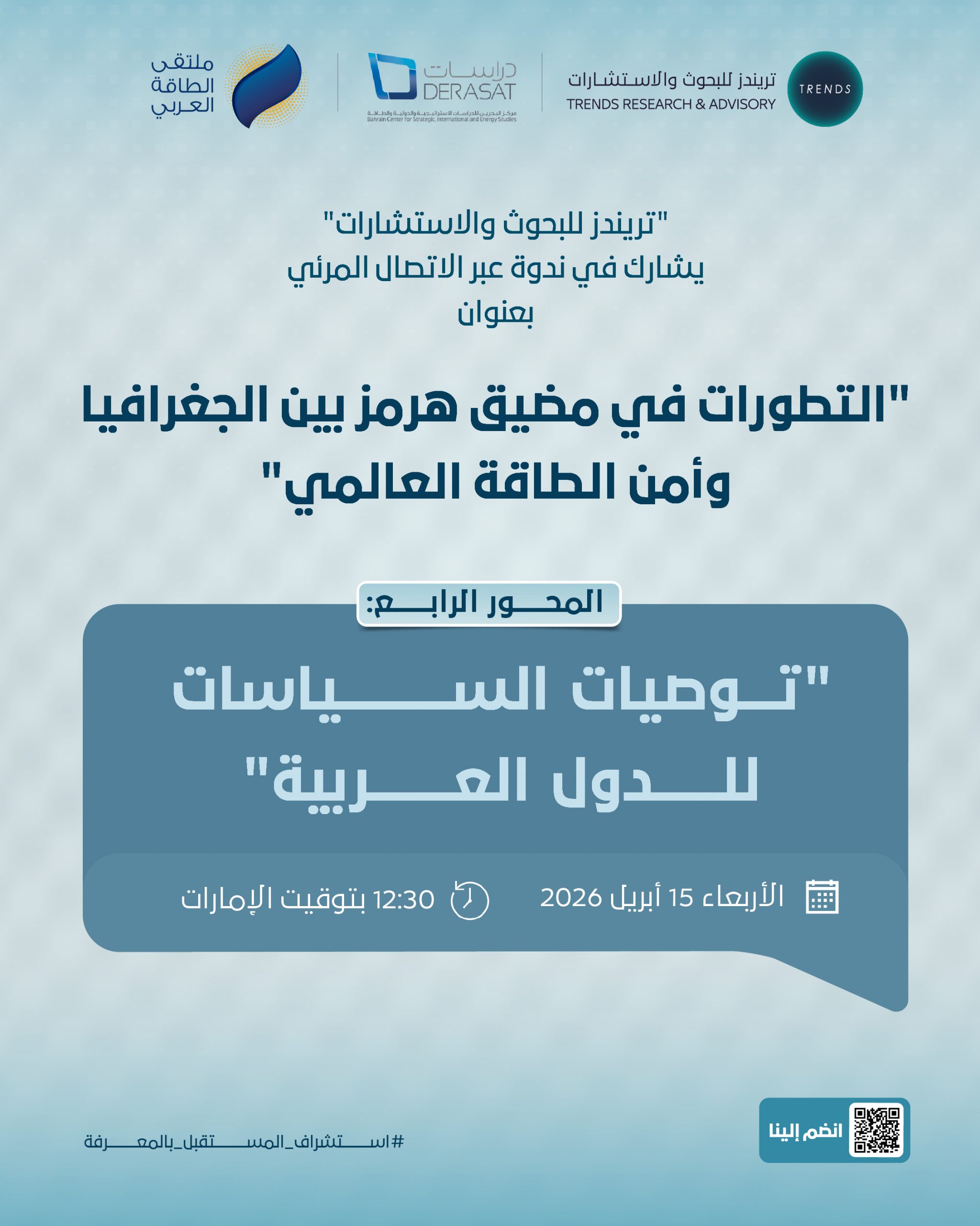 TRENDS Research & Advisory is participating in a virtual seminar organized by the Bahrain Center for Strategic, International and Energy Studies (DERASAT), in partnership with the Arab Energy Forum, on Wednesday, April 15, under the title: “Developments in the Strait of Hormuz: Between Geography and Global Energy Security.” This comes within the framework of examining the rapidly evolving geopolitical implications on the stability of the global energy system.